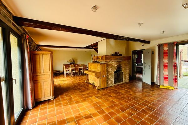 Rez-de-chaussée : Spacieux living lumineux comprenant Salle à manger de ± 30 m² et Salon de ± 25 m² avec feu cassette, Cuisine équipée, Salle de bain, WC séparé